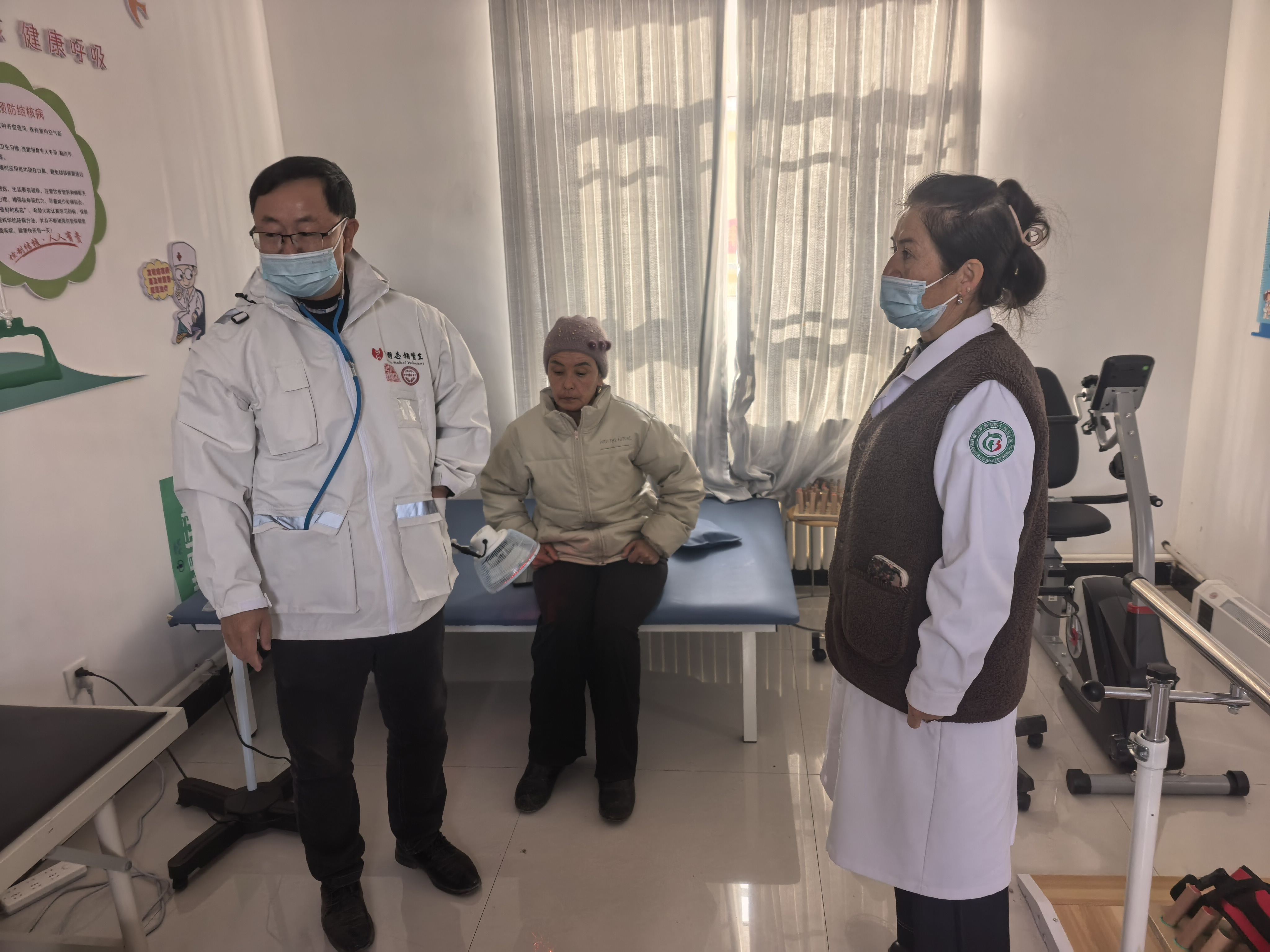 除了看诊,于医生还带着古丽村医重新整理药柜、规范记录病历,并手把手教她使用中频治疗仪和特定电磁波治疗仪等康复设备——这些康复设备是今年七月份北京凌锋公益基金会捐赠的,并在卫生室设立了康复健康小屋。但是当地游牧民居多,居住分散,加上冬季天气寒冷,所以前来卫生室就诊的患者就不多,而且村医对康复设备的操作也不太熟练。于德平老师作为中国志愿医生的一员,同时又是格干沟牧业村卫生室的建站帮扶医生,肩负起了义诊、带教的工作。